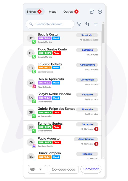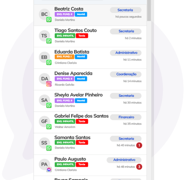 Com a central de atendimento, sua escola será capaz de concentrar todos os atendimentos do WhatsApp e Instagram em apenas um lugar. Com um número principal de contato, todas as suas equipes terão acesso a um ambiente profissional para atender as famílias.