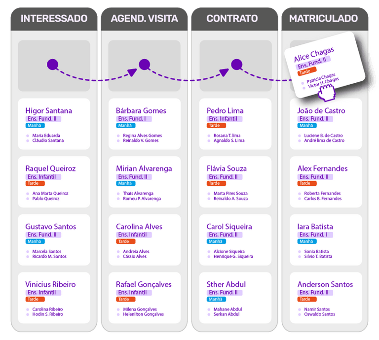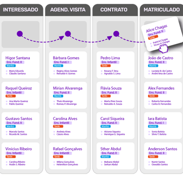 A união do CRM com o funil de captação oferece uma visão panorâmica do seu processo de matrícula. Você terá um fluxo estruturado que guiará potenciais matriculados durante todas as etapas da captação.